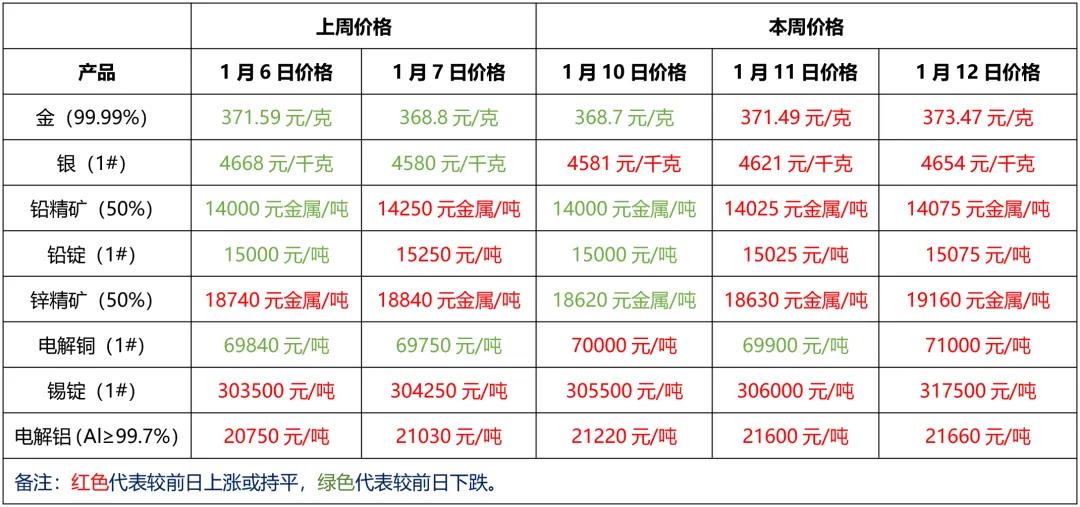 金、銀、鉛、鋅、銅、鋁等主要金屬本周報價