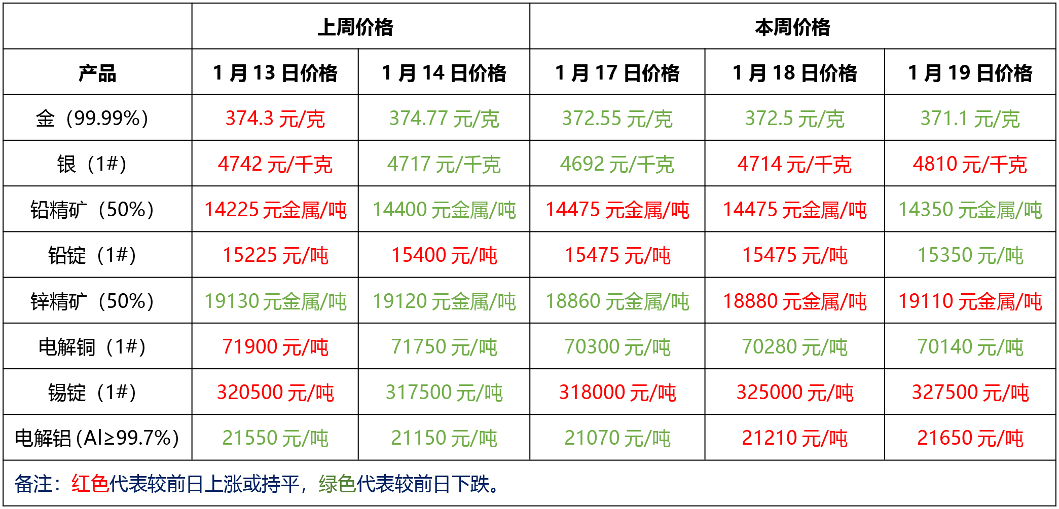 金、銀、鉛、鋅、銅、鋁等主要金屬本周報價