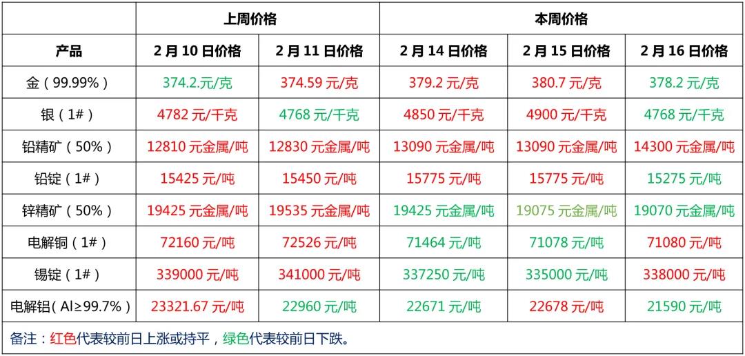 金、銀、鉛、鋅、銅、鋁等主要金屬本周報價
