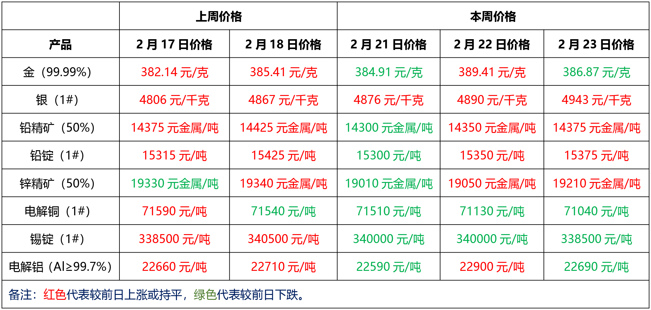 金、銀、鉛、鋅、銅、鋁等主要金屬本周報價