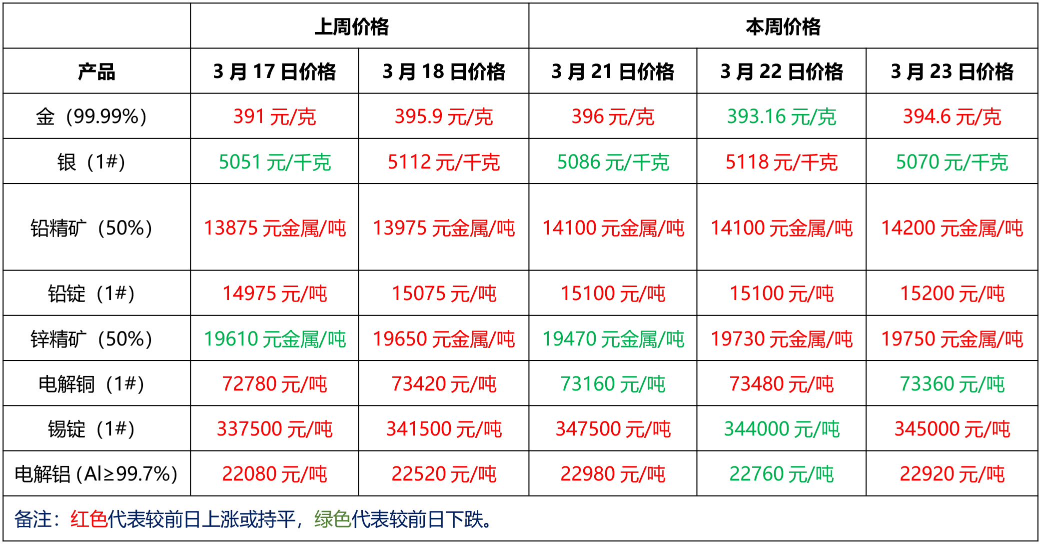 金、銀、鉛、鋅、銅、鋁等主要金屬本周報價