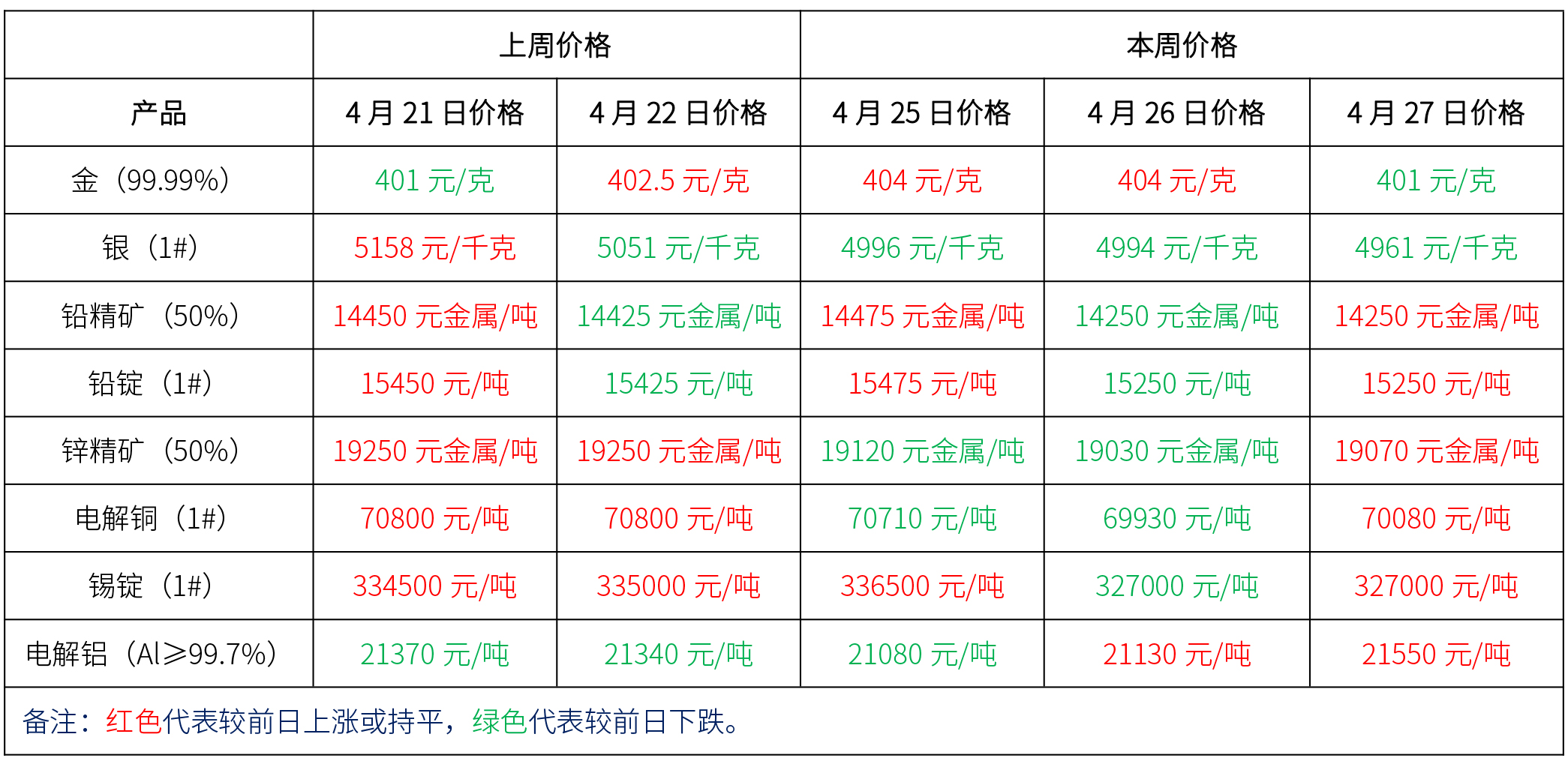 金、銀、鉛、鋅、銅、鋁等主要金屬本周報價