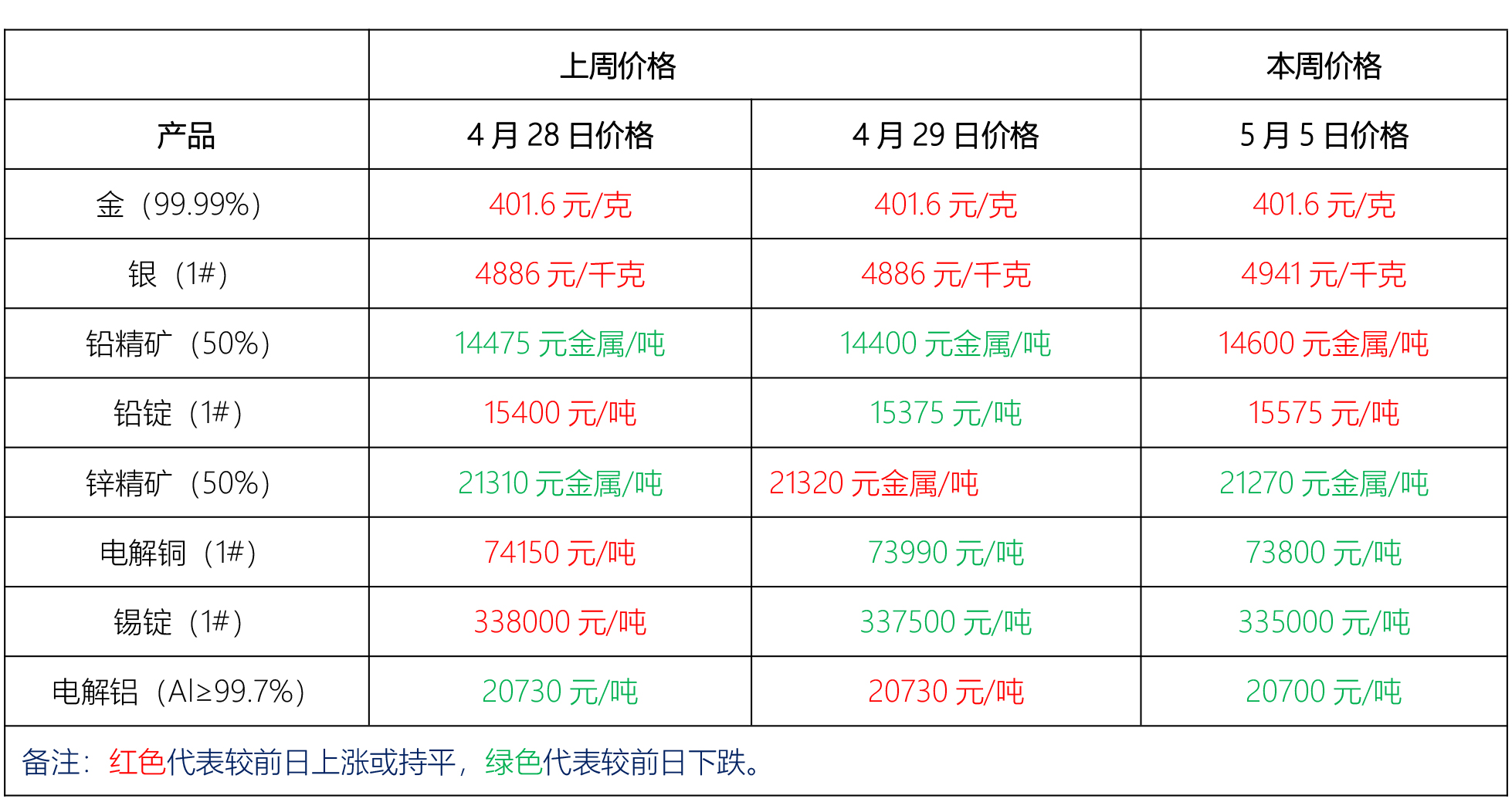金、銀、鉛、鋅、銅、鋁等主要金屬本周報價