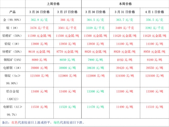 下表為本周金、銀、鉛、鋅、銅、鋁等主要有色金屬礦產品價格變動情況: