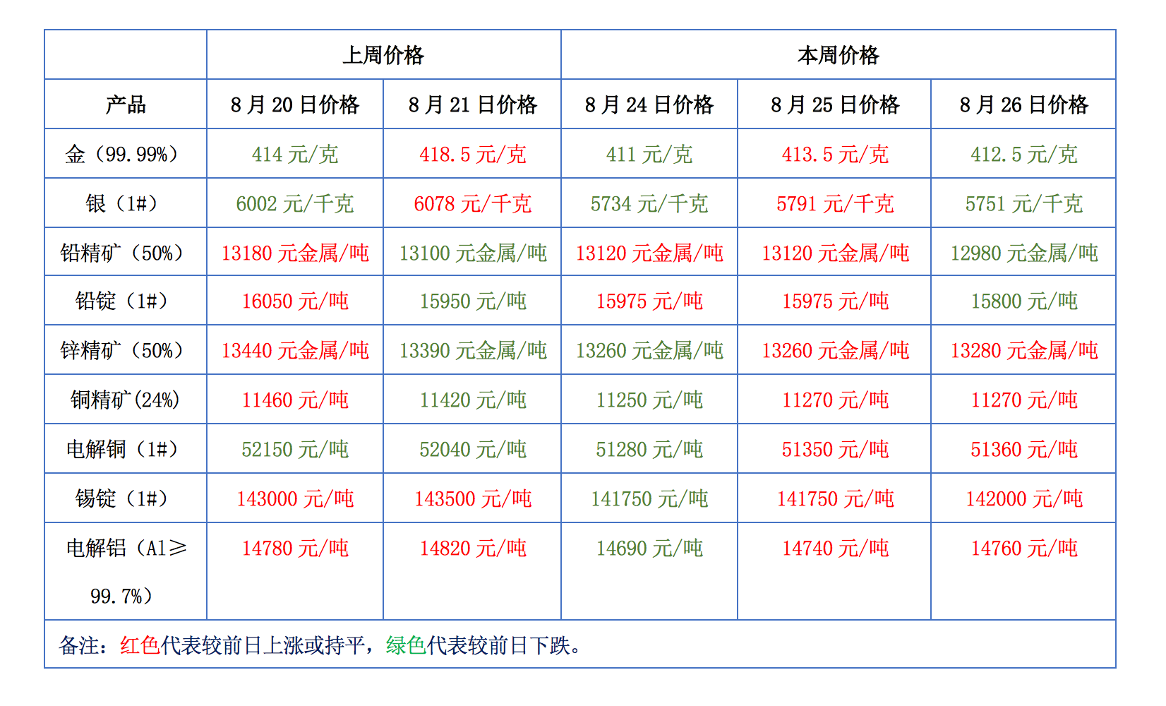 下表為本周金、銀、鉛、鋅、銅、鋁等主要有色金屬礦產品價格變動情況:
