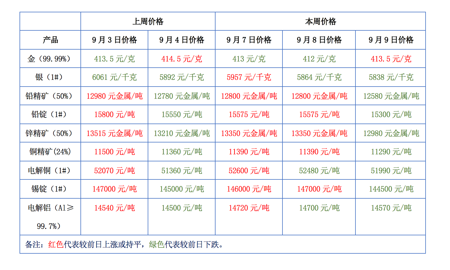 下表為本周金、銀、鉛、鋅、銅、鋁等主要有色金屬礦產品價格變動情況: