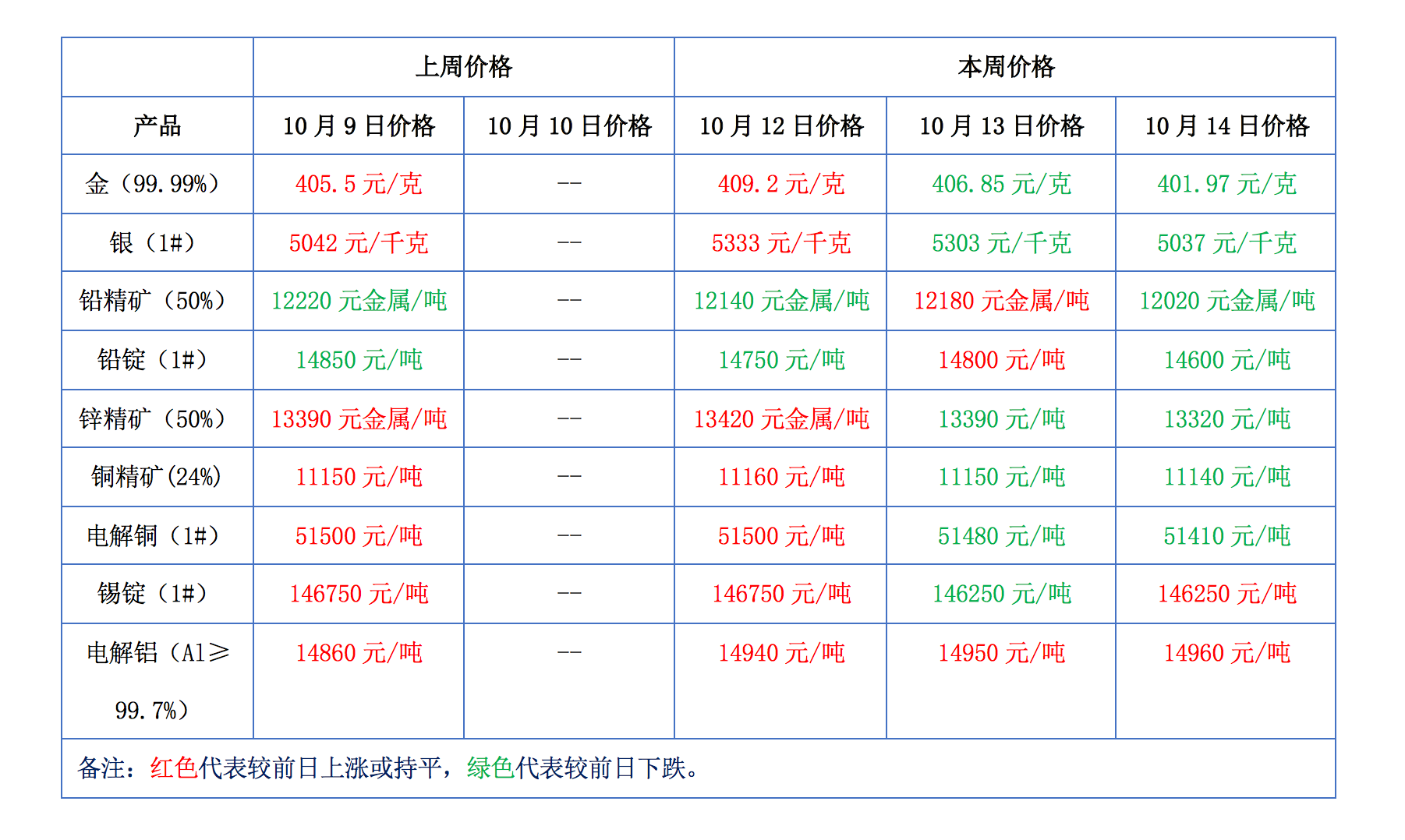 下表為本周金、銀、鉛、鋅、銅、鋁等主要有色金屬礦產品價格變動情況: