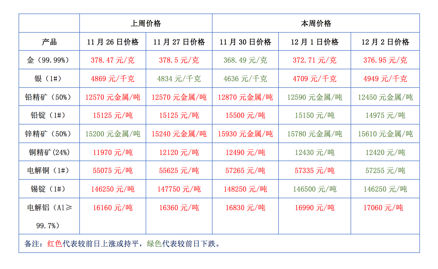 下表為本周金、銀、鉛、鋅、銅、鋁等主要有色金屬礦產(chǎn)品價(jià)格變動(dòng)情況: