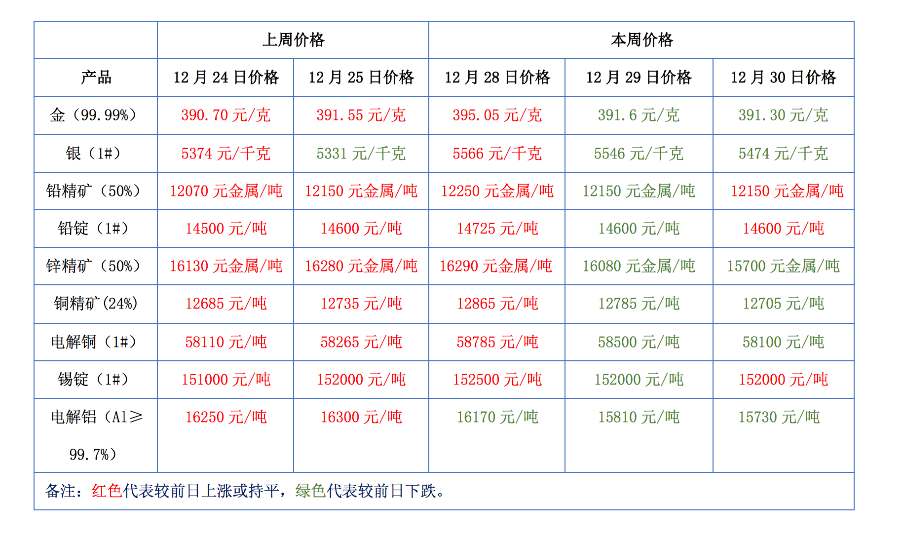 下表為本周金、銀、鉛、鋅、銅、鋁等主要有色金屬礦產(chǎn)品價格變動情況: