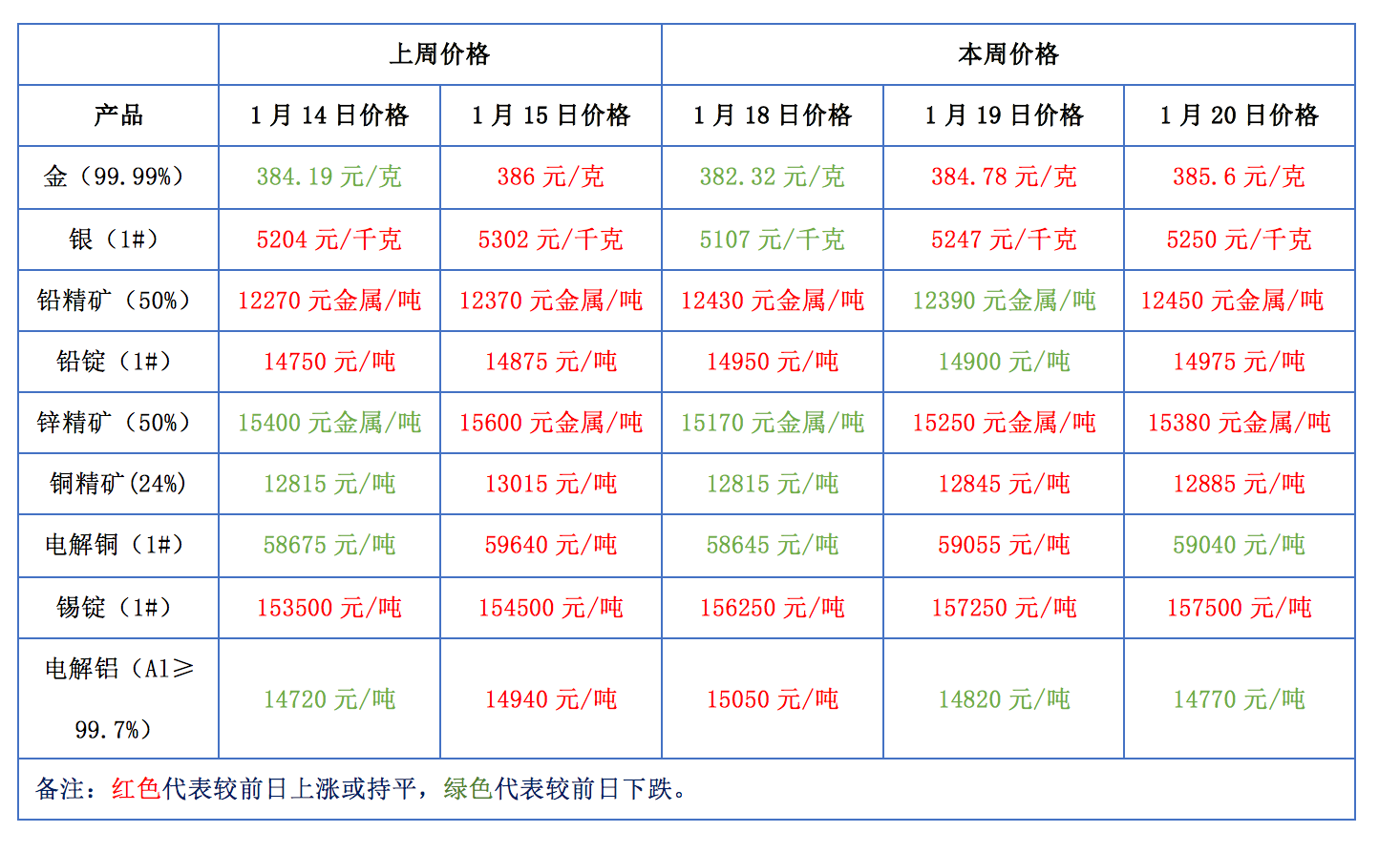 下表為本周金、銀、鉛、鋅、銅、鋁等主要有色金屬礦產品價格變動情況:
