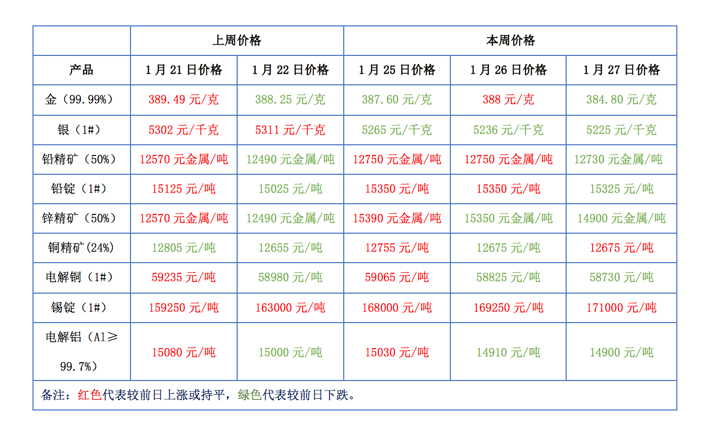 下表為本周金、銀、鉛、鋅、銅、鋁等主要有色金屬礦產品價格變動情況: