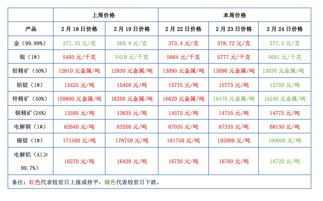 下表為本周金、銀、鉛、鋅、銅、鋁等主要有色金屬礦產品價格變動情況: